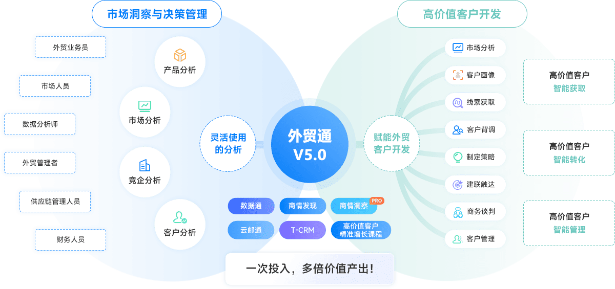 依托AI全新打造的智能、精准的高价值客户开发利器,给予具备全球视野的市场洞察、潜客获取、竞企监测、客户分析等一站式服务